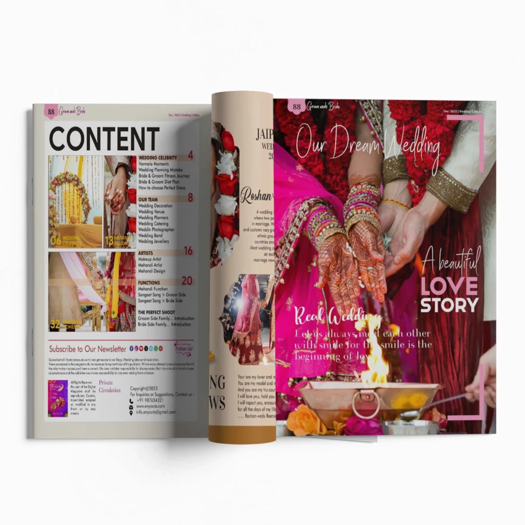 Turn your wedding celebrations into a timeless story with our Wedding Magazine — a personalized keepsake that beautifully captures every moment, detail, and memory. From pre-wedding festivities to the grand celebration, each page is designed to showcase your journey with elegance and style. Perfect for sharing with family and friends, this magazine not only organizes your memories but also becomes a cherished memento that you’ll treasure for a lifetime.