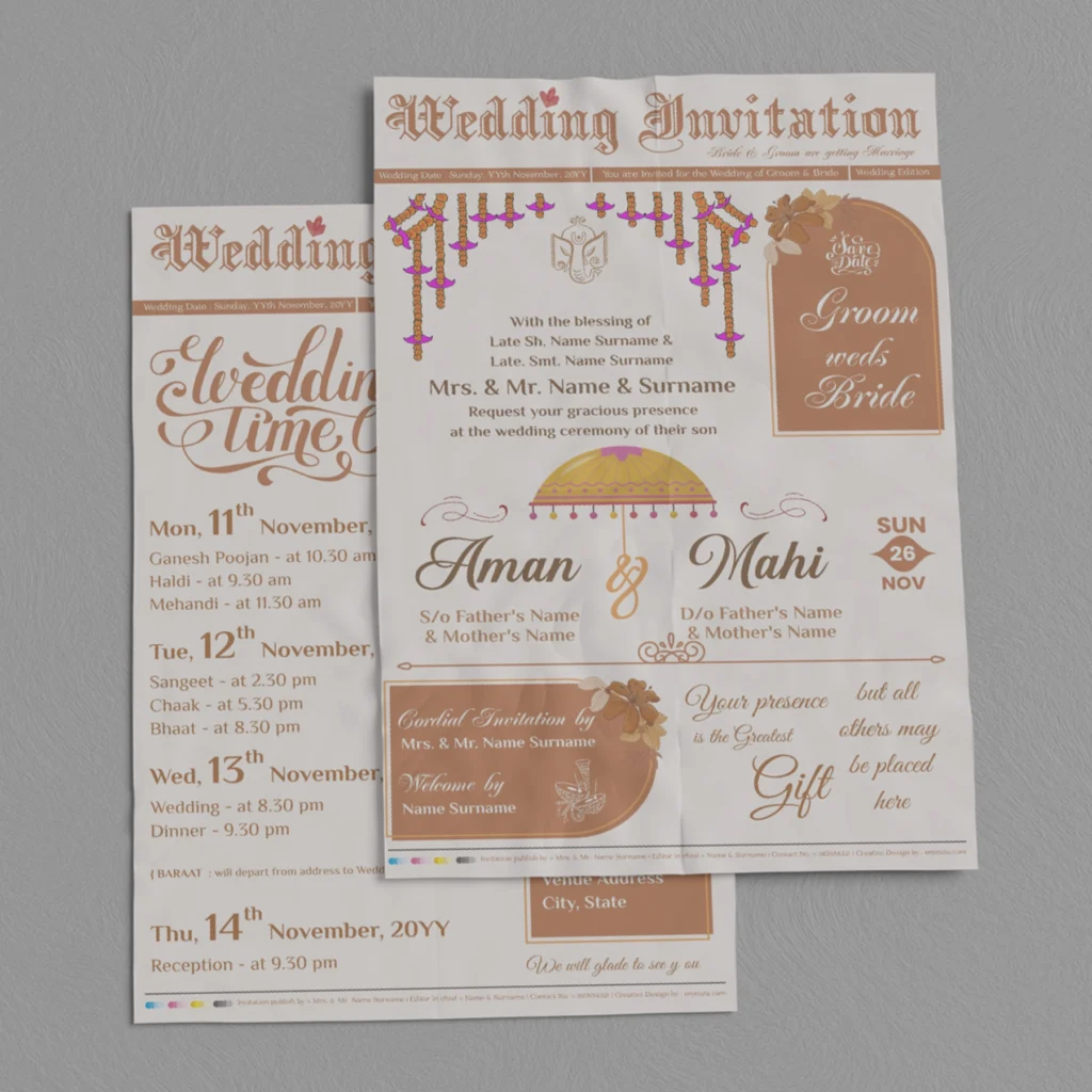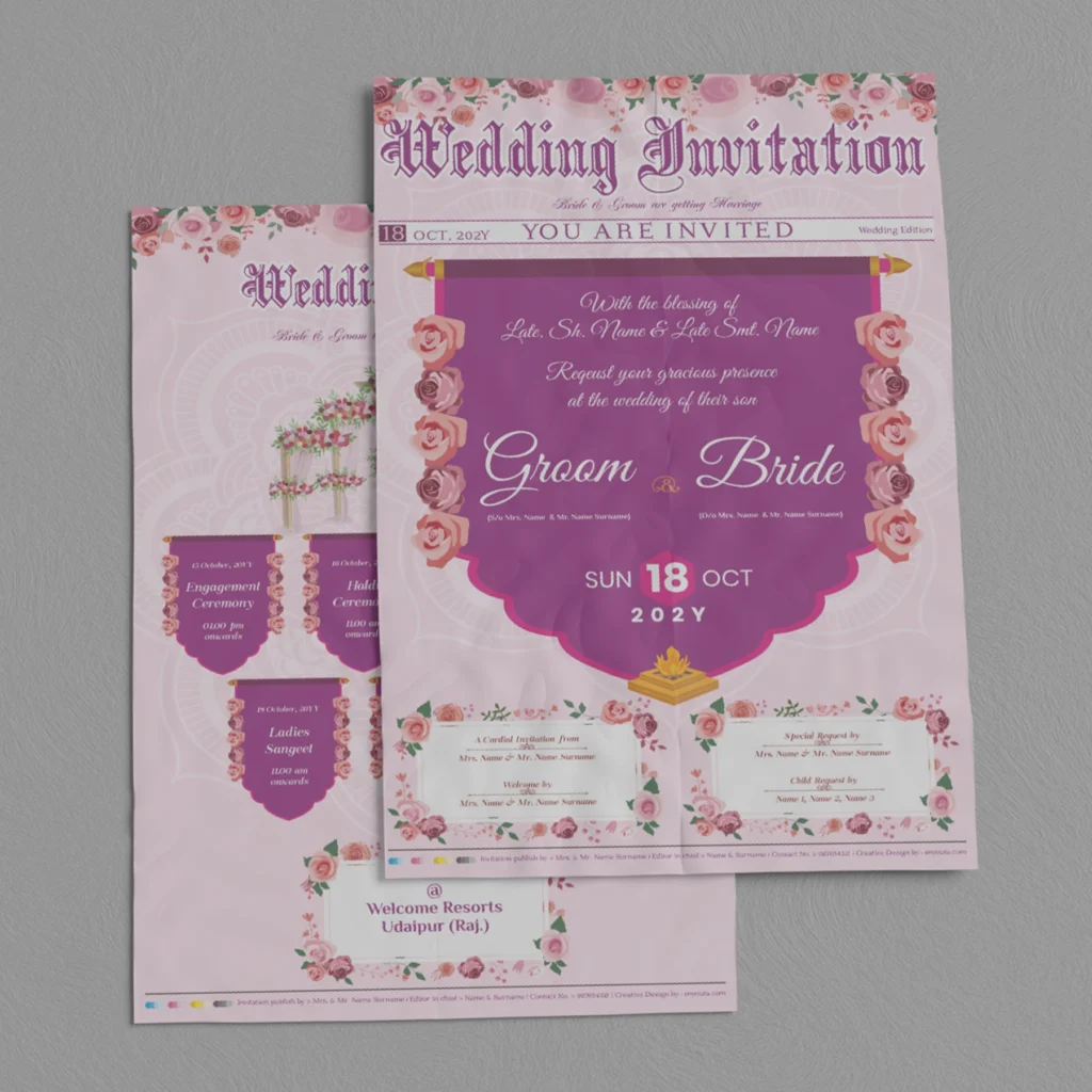 Make your wedding invite a headline-worthy experience with Nyouta Newspaper Theme Wedding Invitations. Perfect for creative couples, these high-quality invitations resemble a real newspaper and are fully customizable with couple names, family detail, wedding date, venue details and other related info. Unique, fun, and memorable, they set the perfect tone for your wedding celebrations.