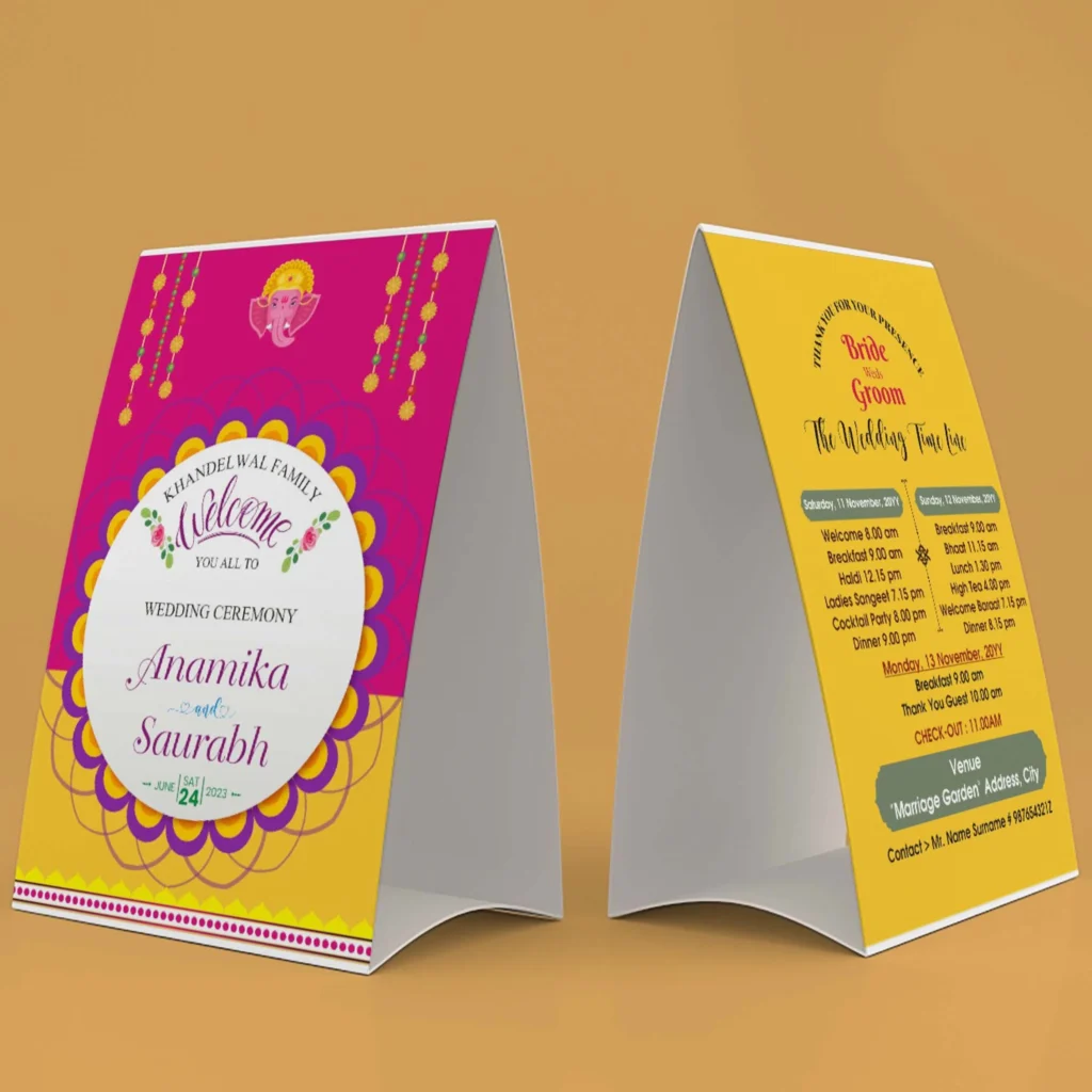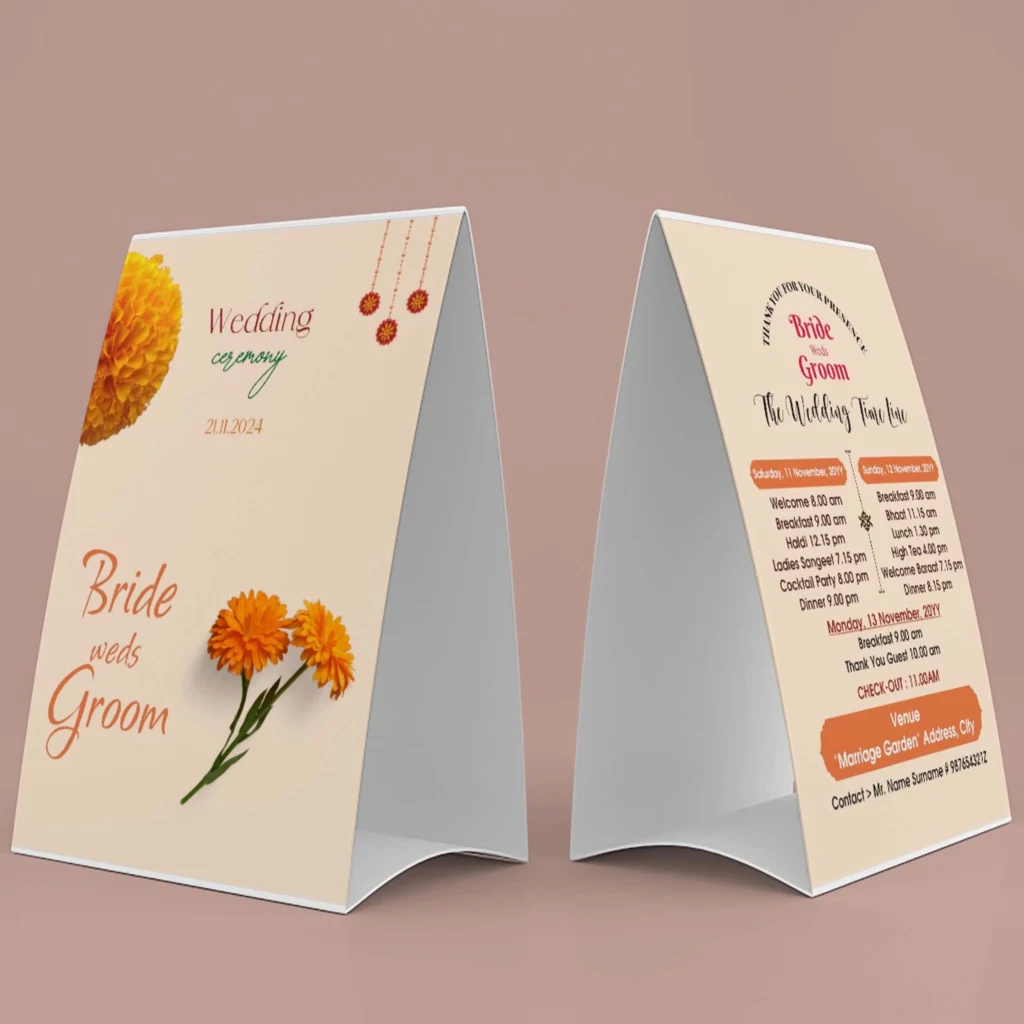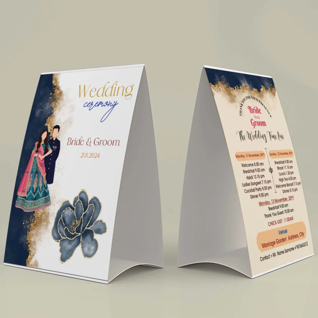 “Welcome your guests with elegance and clarity through our Wedding Room Itinerary Tent Cards. Perfectly designed to be placed on tables in guest rooms, these itinerary cards display complete wedding details, programs, and timelines in a stylish and easy-to-read format. With a tent-stand shape, they are practical, decorative, and memorable. A must-have for every well-organized wedding that ensures guests never miss a single moment of celebration.”