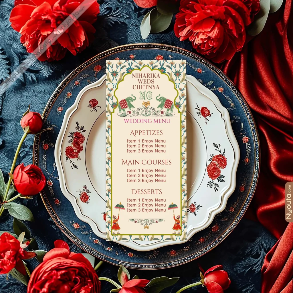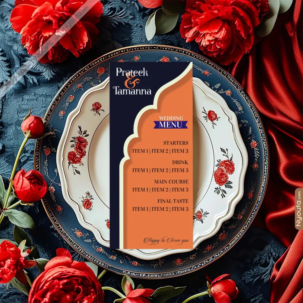 “Add elegance to your dining tables with our Wedding Table Menu Cards. Customized with your names, wedding date, and curated meal details, these cards make every dining experience more personal and stylish. Perfectly designed to match your wedding theme, they guide guests through the menu while adding charm to the décor. A must-have accessory that combines functionality with elegance, making your celebration unforgettable.”